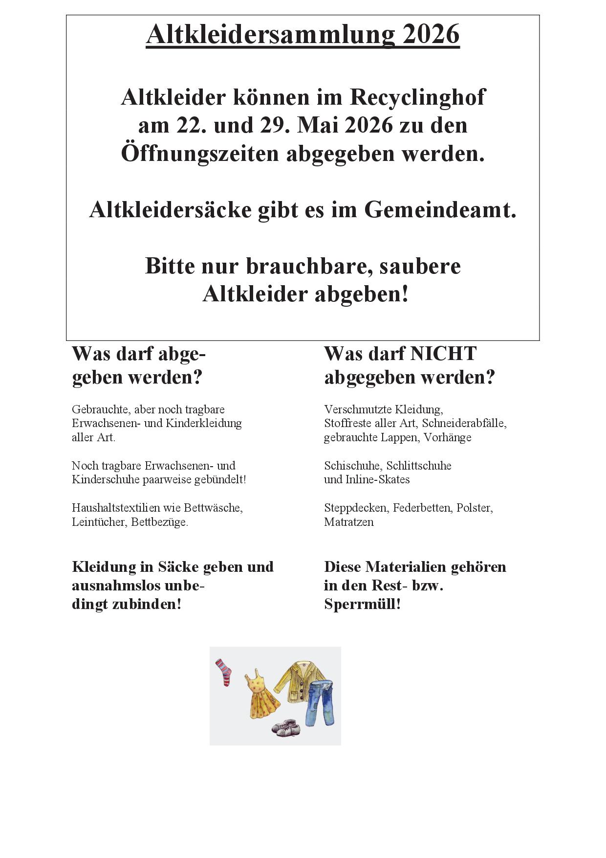 Altkleidersammlung 2026! Abgabe am Recyclinghof am 22. und 29. Mai 2026!